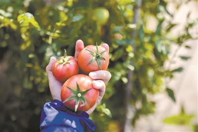廣州市海珠區O2PARK創客公園一處企業樓頂,員工摘下剛成熟的色澤鮮艷的新鮮番茄