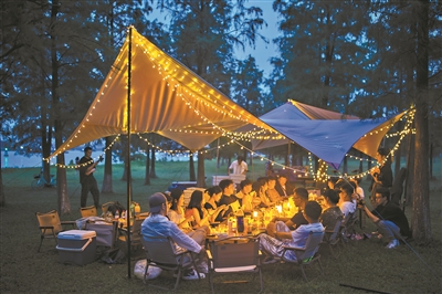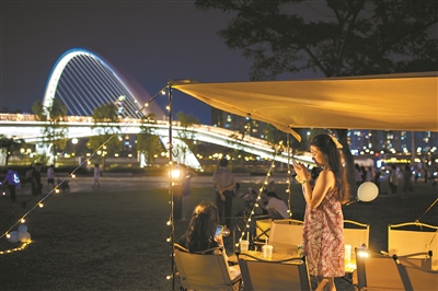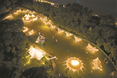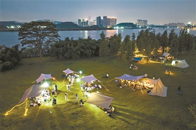 二沙島藝術(shù)公園的草坪上,城市的燈火與露營的彩燈交相輝映