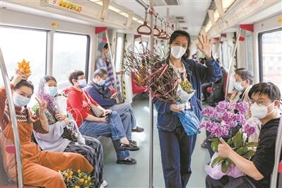 地鐵5號線滘口站內,廣州市民扛著購買的年宵花踏上地鐵,車廂內立刻生機勃勃,儼然成了“年花專列”。