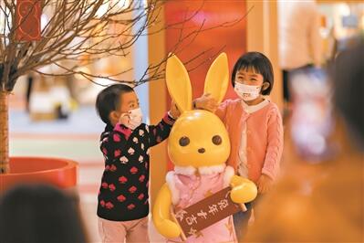 新春氛圍已悄然上線,天真可愛的孩子們和兔子玩偶一同玩耍。