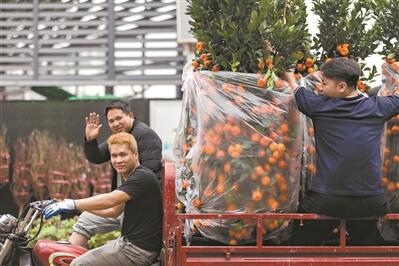 嶺南花卉市場,運送年桔的三輪車上,三位小伙朝著鏡頭揮手致意,年味滿滿。