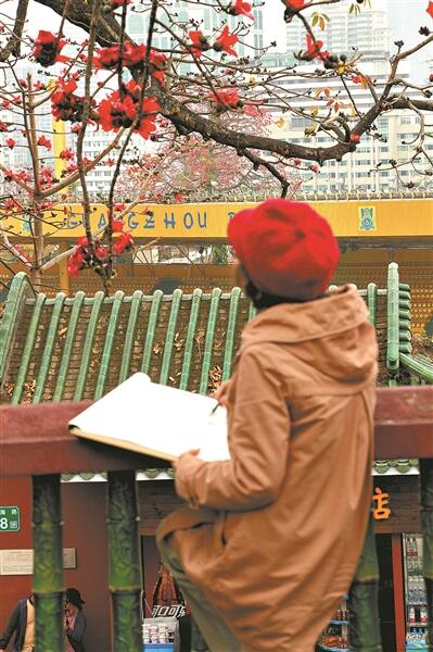 木棉花的精神也滋養著一代代羊城人。木棉盛開的時節,很多街坊都會賞紅棉。樹上是盛放的木棉花,樹下是用長槍短炮記錄木棉花的人群。每到開花時節,市民譚女士都會從江南西趕來人民橋邊的木棉樹下,與木棉花零距離合影。她告訴記者,自小就與這棵“木棉王”相伴,像相熟的老友,每年花開時節也是老友相聚踏青的時候。