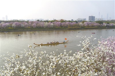 海珠濕地公園沿石榴崗河兩岸的宮粉紫荊次第綻放,龍船和皮劃艇猶如穿行在畫(huà)中。