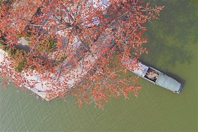 一艘漁船停靠在盛開(kāi)的木棉花下,畫(huà)面頗有南國(guó)風(fēng)情。