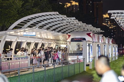 夜幕降臨,華燈初上,游客們乘坐有軌電車,游覽“最美七公里”,飽覽珠江兩岸的夜景。