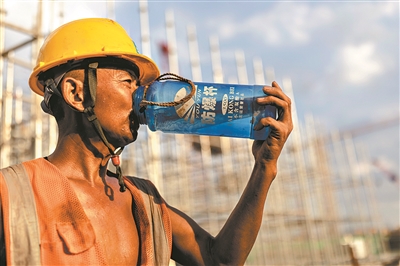 7月24日,T3航站樓施工現(xiàn)場,建筑工人的皮膚被曬得黝黑。休息的間隙,他捧起水杯補充水分。