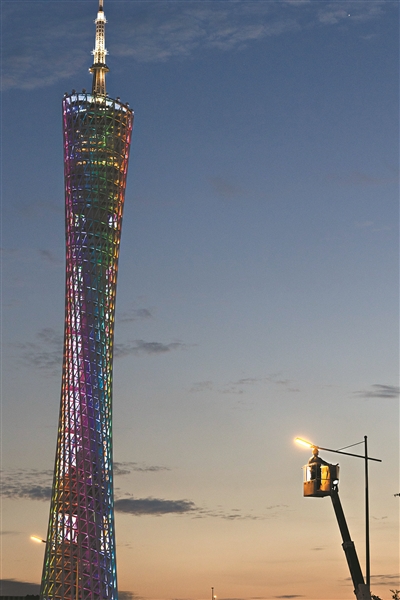 暮色四合,夜風燥熱,傍晚的廣州暑熱仍未退去。7月21日,都市霓虹綻放夜空,照亮披星戴月的電力檢修工人。