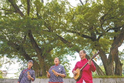 現(xiàn)場,洪運妹又即興唱起客家山歌《油菜花盛開的時候》,“油菜花盛開的時候,春天在王子山停留。花海里蜂蝶飛舞小鳥歌唱,暖洋洋的風(fēng)緩緩吹進心頭……”伴隨著“啪啪啪”節(jié)奏輕快的快板打擊聲,一個個嘹亮清脆的字符不斷傳開,吸引了附近的村民聚集過來,饒有興致地聆聽這樸素濃情的歌聲。微風(fēng)吹過,古榕樹的葉子微微顫動,發(fā)出“沙沙”聲音,仿佛是輕輕和聲伴奏,一幅人與樹和諧共生、你唱我和的溫馨場景在這里得到生動詮釋。只聞余音裊裊在大樹四周不斷回旋,不絕如縷。