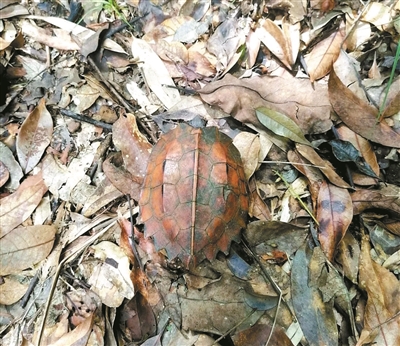 隨后,專業(yè)隊伍深入實地調(diào)查。在叢林中,他們幸運地“偶遇”了這只龜。經(jīng)測量,龜?shù)谋臣组L約11cm,寬約8cm,前后緣呈強烈鋸齒狀,中央具三條嵴棱,腹甲棕黑色。經(jīng)對比鑒定,是地龜,國家二級保護動物。經(jīng)對比保護區(qū)動物名錄,沒有記載該物種,為保護區(qū)新增物種記錄。