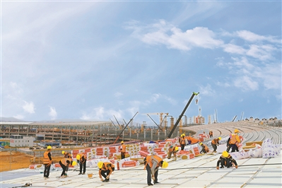 春節期間,白云機場T3航站樓建設現場“熱度”和“速度”絲毫不減,春節留守的工人在屋面上施工。
