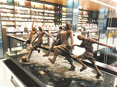 “門官廳”的一側,一道景觀樓梯,錯落層疊,瓦當紋裝飾的墻面上賦有多個廣州文化地標簡述,彰顯一派嶺南建筑氣象。店內隨處可見的“鑊耳山墻”“滿洲窗”圖案,讓人情不自禁喚起老廣州的記憶。收款臺后北京路老街道場景的銅雕主背景,打造“繁盛之所,博學殿堂,華燈璀璨,靜謐書齋”的景象。