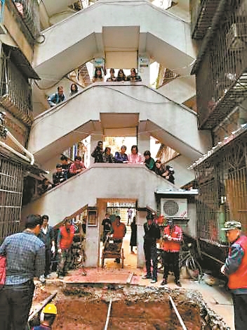 越秀區(qū)犀牛北街97號(hào)居民樓加裝電梯時(shí),意外發(fā)現(xiàn)了古墓,考古隊(duì)員在地下挖,居民站在樓梯和走廊上看