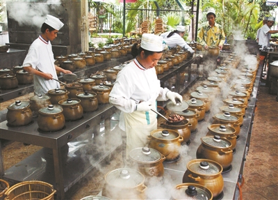 唐宋時期,隨著大庾嶺驛道的開通、西江通航以及海上交往頻繁,南北交往、內外聯系更加暢順,中原飲食、南越飲食、海內外飲食交相融合,湯漸漸開始成為待客美食。據唐昭宗時期(867年-904年)出任廣州司馬的劉恂在《嶺表錄異》一書中記載,當時嶺南人家特別流行喝“不乃羹”。它是用羊肉、雞肉、鹿肉與骨頭一起煲成的湯,肥濃鮮美,上菜的時候,肉撈出來棄之不用,只以湯待客。當時請客人吃飯,宴席上必須有一道“不乃羹”。一大盆“不乃羹”擺在席上,大家用一個大勺子輪流取飲。喝了這道湯,就沒什么事辦不成,故名“不乃羹”。