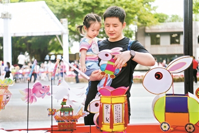 一對(duì)父女被彩燈攤位前的作品所吸引。