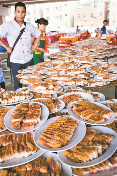 《廣東新語》中有這樣的描述:“歲五六月間斗龍船”,龍船“得勝還埠,則廣召親朋燕飲”。這種宴飲,珠三角人稱為食“龍船飯”。有些村一次“招景”龍舟多達六七十條,2019年農(nóng)歷五月初三,從四鄉(xiāng)前來車陂“趁景”的龍船多達200多條,擺設(shè)數(shù)百圍宴席的“龍船飯”,熱鬧程度不亞于過年。趁景后的“龍船飯”是重頭戲,白切雞、燒鵝、鴻運燒肉、發(fā)菜伴蠔豉等各色菜式令人垂涎。其中,最少不了的是一道簡單小炒——龍船丁,用豆角粒、辣椒圈、咸蘿卜、花生粒四樣材料炒制,可以幫助剛從河水中出來的龍船隊員們祛濕。吃飯時,老人們也會念出好意頭:“吃完龍船丁,添子添丁多福氣。”