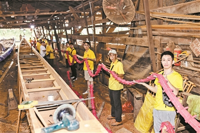 河涌邊,綠樹掩映,一座座低矮廠房成排矗立;廠房里揮汗如雨,木屑紛飛,工匠們一錘一刀手工雕琢嶺南水鄉人的圖騰——龍舟。