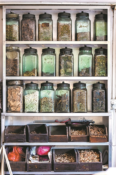 革新路,山草堂草藥涼茶店鋪內,藥材琳瑯滿目