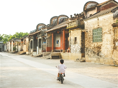 古老的祠堂與廣場上騎車的小孩子形成了一幅頗有意趣的畫面
