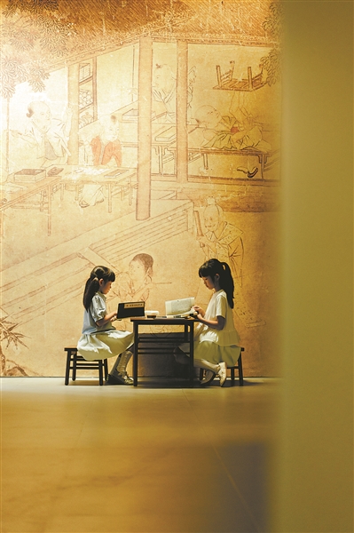 古時,孩子入塾習字,要從描紅開始,繼而摹寫,然后才是臨寫,“身正筆正”的理念從小在心里埋下。展廳中,《乾隆四十三年陳詩的殿試卷》真跡令人驚嘆,全文超過1300字,一字不錯,一氣呵成。一位孩子在電子觸摸屏,嘗試用毛筆臨摹,寫了幾個字,就感受到“身正筆正”之難。