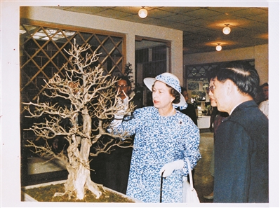 1986年10月18日,英女王在流花西苑欣賞盆景
