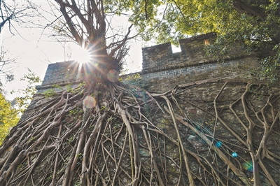 走進越秀公園西門,可以看見一段殘存的明代城墻。這是廣州現存最古老的城墻,青磚布滿綠苔,榕樹在墻上盤根錯節。抬眼一看,絳紅的鎮海樓巍然屹立。