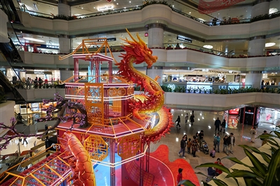 春節期間,天河路商圈“龍”年主題展陳頻頻上新。廣州天環Parc Central打造“魚躍龍騰有錢花”新春特展,糅合新潮趣味藝術IP“有錢花RICH FLOWER”。天河城推出“祥龍獻瑞,齊嘆天河”新春主題展,傳統古風園林式建筑象征祥瑞中國龍盤踞其間。廣州太古匯呈現亞洲首個藝術空間展“潛龍見瑞”,解鎖潛龍秘境盛宴。