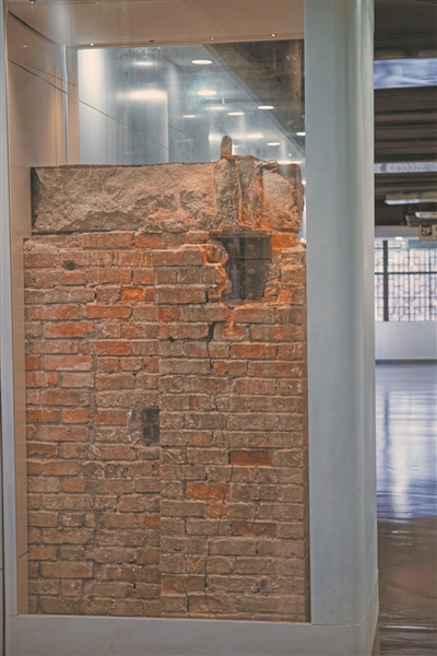 在廣州華僑博物館,玻璃保護起一段老建筑的磚墻。