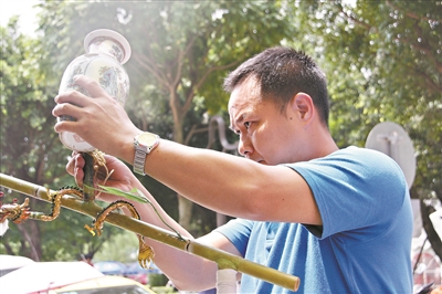 記者看到,“色梗”其實就一條手指粗細的鋼枝,固定在色柜上,支撐演員“飄”在空中。經過飄色藝人的巧妙掩飾,“色梗”極其隱蔽,即使沿街巡演時,觀眾與飄色近在咫尺,也難以發現“色梗”的存在。