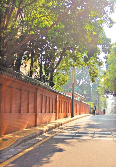 沿著廟前直街向東漫步,不久便來到了被譽為“廣州醉美大斜坡”的培正路,但見樹影婆娑,一對新人在綠瓦黃墻的映襯下拍攝婚紗照,定格一生中最美好的瞬間。