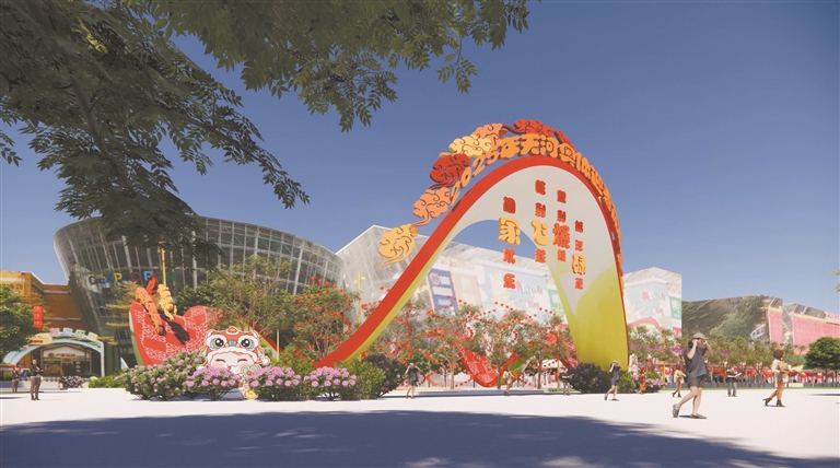 今年將在寶崗大道花市出入口處搭建“海珠迎春花市”的主牌樓,濱江東、西面出入口搭建副牌樓。2025年海珠花市牌樓以“海港古韻,靈蛇獻瑞”為靈感,保留傳統建筑韻味的同時融入現代設計元素,參照傳統古建大宅的空間布局以及港口吊機和航標塔的形象,體現海珠區作為海上絲綢之路重要港口的歷史地位。