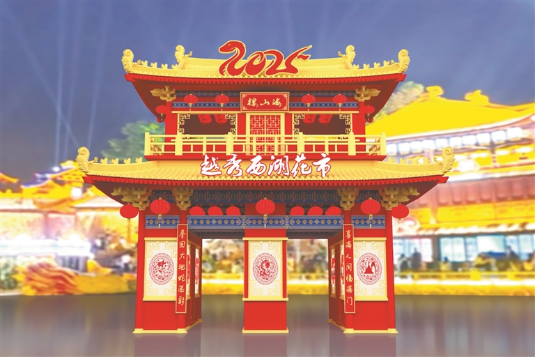 2025年越秀西湖花市以“古越今秀老城市·百年花市新活力”為主題,延續“百年花市,源于越秀”的歷史傳承,持續擦亮“廣州過年 花城看花”品牌。主牌樓以北宋“海山樓”為原型設計。