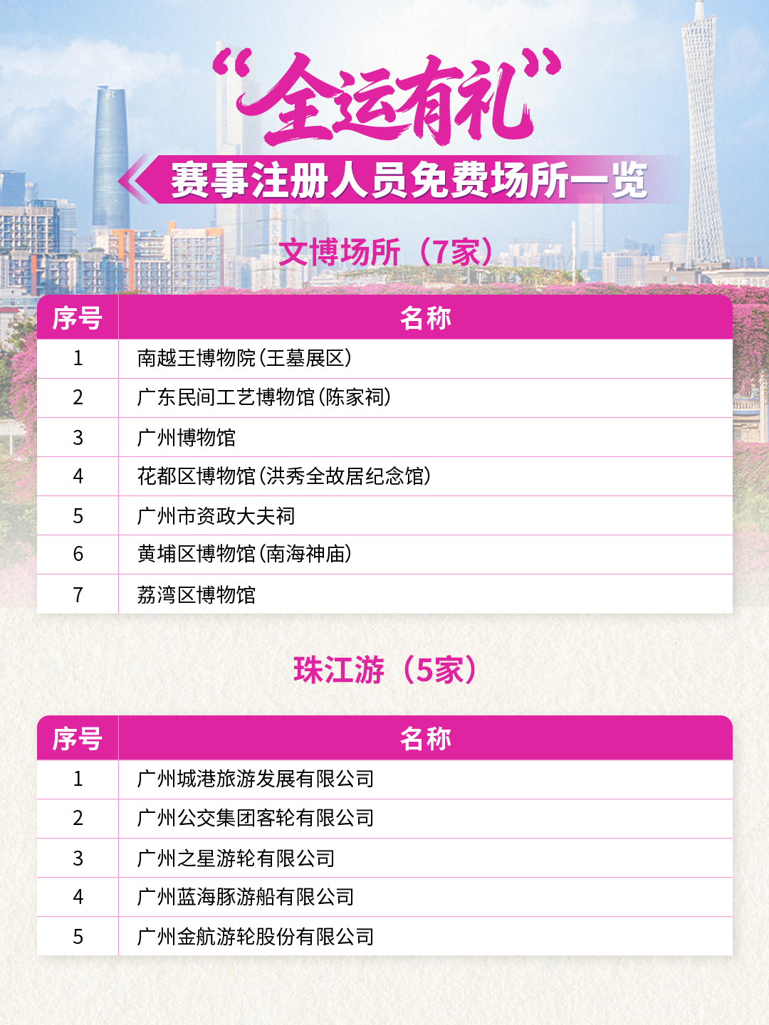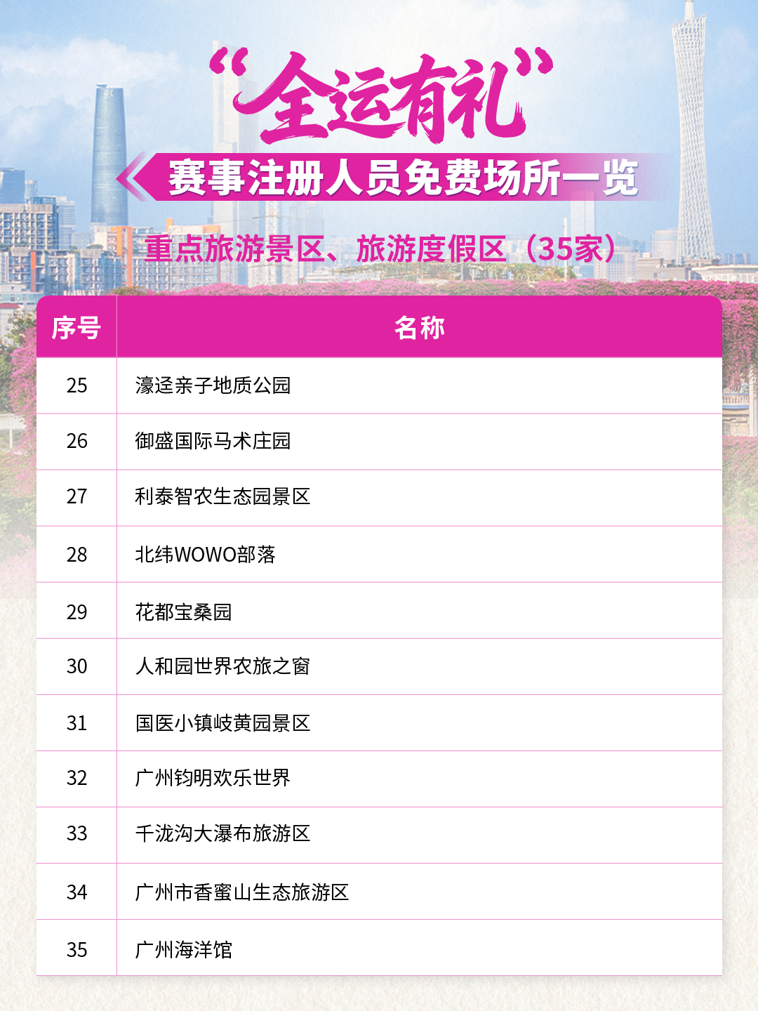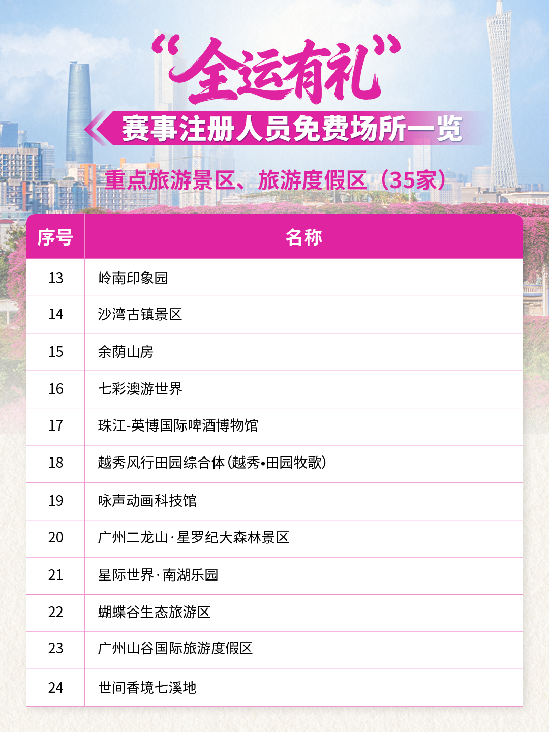 全運(yùn)倒計(jì)時(shí)!59家景區(qū)/場(chǎng)所聯(lián)合獻(xiàn)禮!10月20日-12月20日期間參與十五運(yùn)會(huì)和殘?zhí)貖W會(huì)的運(yùn)動(dòng)員、領(lǐng)隊(duì)、教練、裁判員、輔助裁判員、技術(shù)官員以及賽事注冊(cè)記者,憑本人大會(huì)證件及身份證(或其它有效身份證件),在這些場(chǎng)所可享首道門(mén)票免費(fèi)!