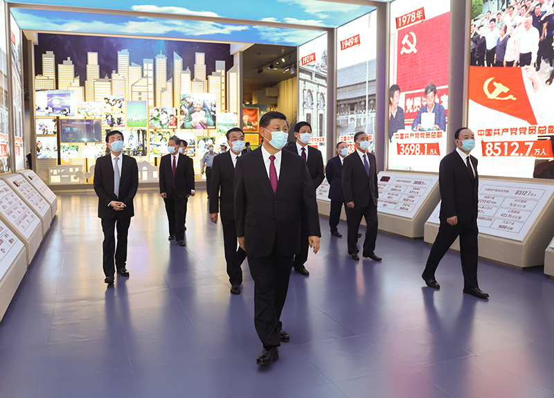 新近落成的中國共產(chǎn)黨歷史展覽館巍然矗立,氣勢恢宏。下午3時20分許,習(xí)近平等黨和國家領(lǐng)導(dǎo)同志來到這里,步入展廳參觀展覽。展覽以“不忘初心、牢記使命”為主題,精心設(shè)計了“建立中國共產(chǎn)黨 奪取新民主主義革命偉大勝利”、“成立中華人民共和國 進(jìn)行社會主義革命和建設(shè)”、“實(shí)行改革開放 開創(chuàng)和發(fā)展中國特色社會主義”、“推進(jìn)中國特色社會主義進(jìn)入新時代 全面建成小康社會 開啟全面建設(shè)社會主義現(xiàn)代化國家新征程”4個部分,通過2600余幅圖片、3500多件套文物實(shí)物,第一次全方位、全過程、全景式、史詩般展現(xiàn)中國共產(chǎn)黨波瀾壯闊的百年歷程,濃墨重彩地反映黨的不懈奮斗史、不怕犧牲史、理論探索史、為民造福史、自身建設(shè)史,使人們深刻認(rèn)識到紅色政權(quán)來之不易、新中國來之不易、中國特色社會主義來之不易,深刻認(rèn)識到中國共產(chǎn)黨為什么能、馬克思主義為什么行、中國特色社會主義為什么好。