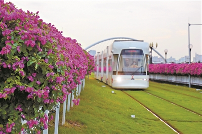 有軌電車兩側(cè)開滿了簕杜鵑