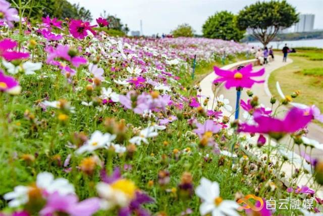 成片的波斯菊怒放,紫紅、粉紅或白的