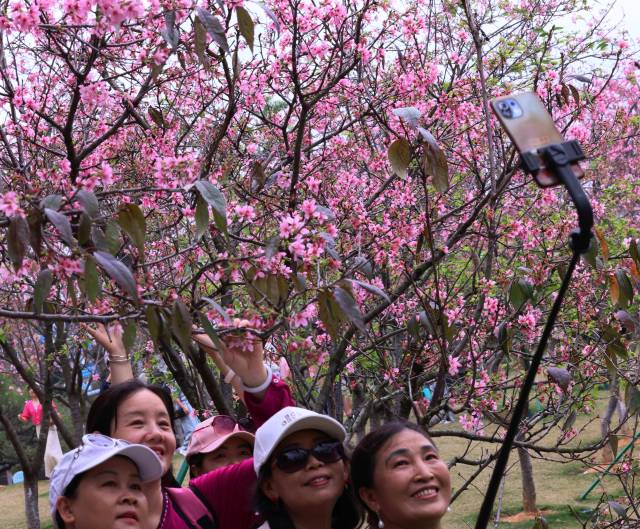 走進創(chuàng)業(yè)公園,粉紅色的櫻花絢爛盛放,游客或漫步于花間小徑,或坐在湖邊長椅上,欣賞著櫻花在春風(fēng)中搖曳生姿。游客羅小姐和好友穿著漂亮的旗袍,在花海中拍照留念。羅小姐說:“這里的櫻花規(guī)模比別的地方大,很茂盛,非常適合拍照,給我們留下了美好的回憶。”