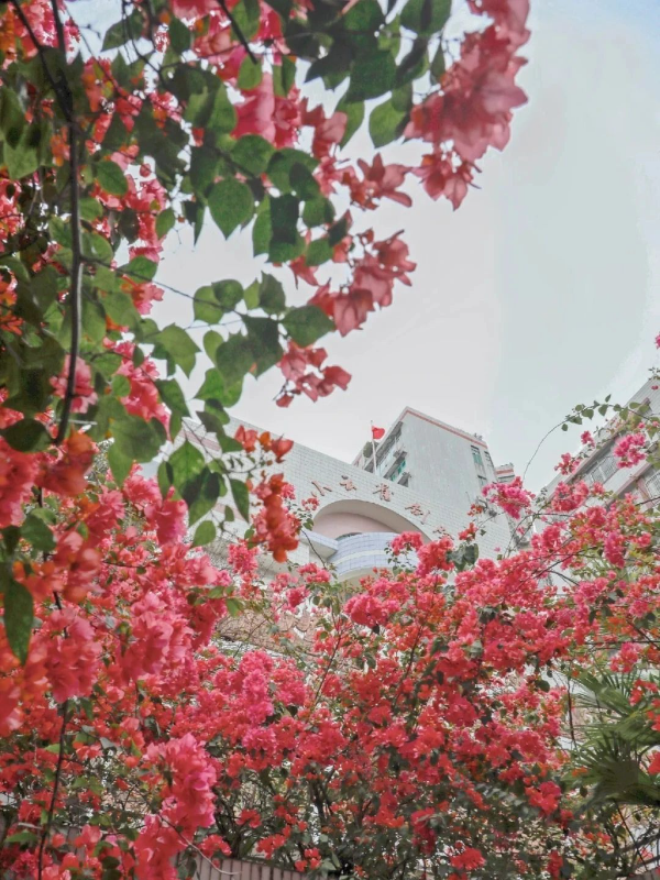 三角梅、宮粉紫荊、黃花風鈴、炮仗花……越過青青草地,在校園里閑逛,勾起青澀的青春回憶。