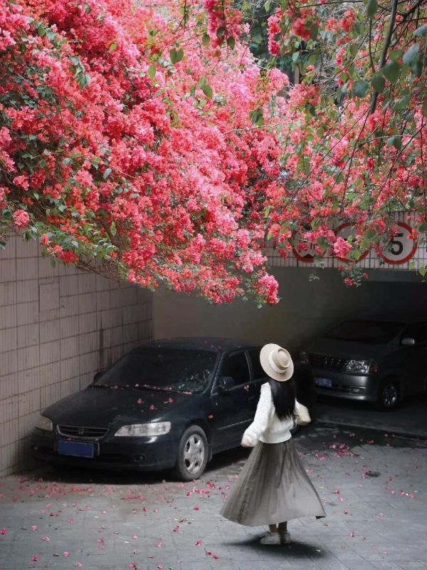 停車場的三角梅正值盛花期,微風輕拂,花瓣紛紛揚揚地落下,走在路上,抬頭一看,熱烈的三角梅讓平凡的日子沾滿了浪漫。