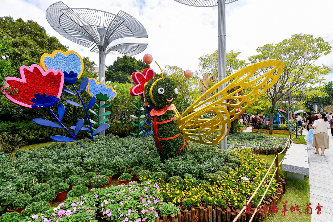 通過匠心菊花扎作工藝,本屆菊會扎作了極具灣區和本土特色的景組,包括位于正門的主題景組《繽紛多彩》,通過菊藝扎作的廣州塔、大三巴、香港中銀大廈等灣區地標建筑,以及西南廣場的大型景組《花之約》,整體造型有如廣州市花紅棉,以及其中裝飾的荷花、簕杜鵑等不少灣區城市的市花。