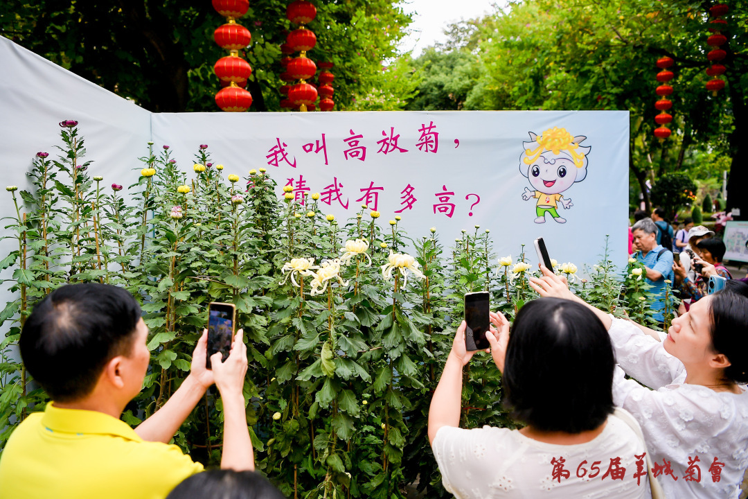 今年菊會首次展出的棒棒菊,是時下流行的一種菊藝產品,其品種來源于地被菊(小菊),通過嫁接于青蒿、黃蒿,長成直立堅挺的形態,因像“棒棒糖”而得名“棒棒菊”,其顏色豐富,花型緊湊形成球狀,造型清新可愛,特別受小朋友和年輕人的歡迎。本次展出的棒棒菊有南方培育品種,也有來自北方的品種,各具特色,不分伯仲。繼去年羊城菊會首度展出高樁品種菊,受到游客的熱烈追捧后,本屆菊會再次展出巨型的高放菊,這次展出的高放菊高達2.3米,刷新了品種菊的高度。