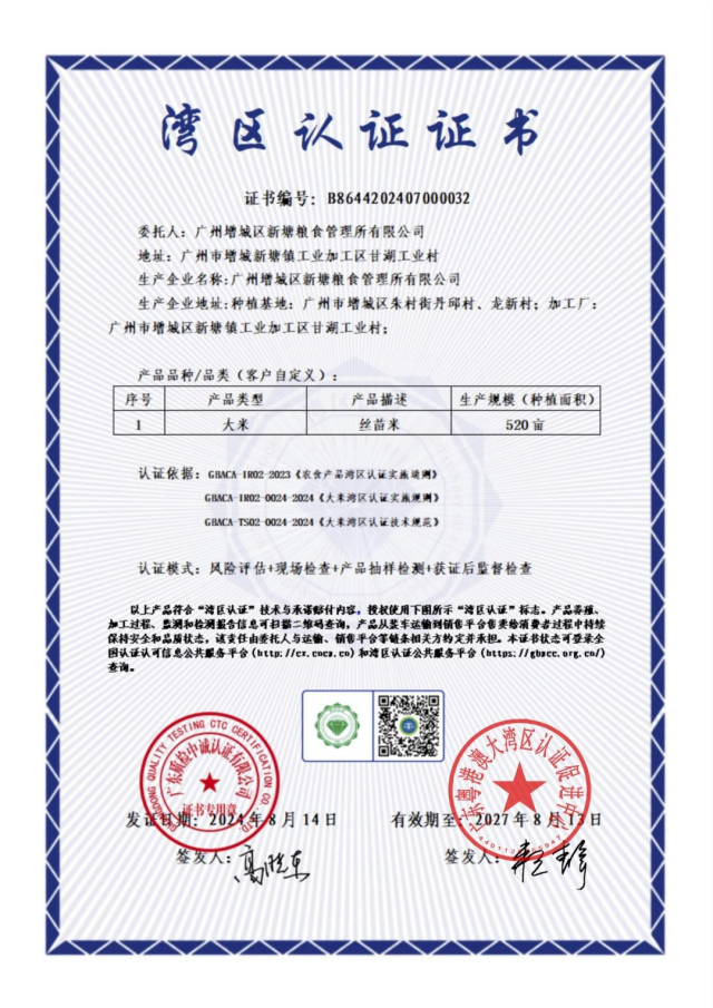 “增城絲苗米獲得‘灣區認證’,將有助于深化構建產品全過程質量管控體系,助推增城絲苗米成為粵港澳大灣區消費者‘優選’‘盲選’的高品質產品。”增城農投集團下屬公司增城區新塘糧食管理所有限公司負責人說,公司抓住“農頭工尾”“糧頭食尾”,一直致力于推動絲苗米產業高質量發展,形成了以“基地+品牌+市場”的系統循環機制,擁有絲苗米推廣種植基地面積,努力構造“從農田到餐桌”產業鏈,擦亮增城絲苗米金字招牌,打造放心大米。