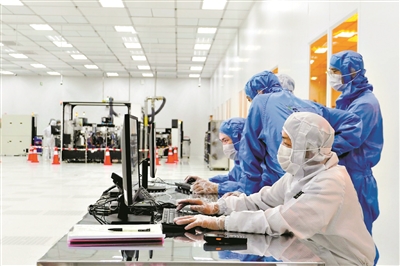 車間內24小時維持無塵狀態,恒溫恒濕,四季如春,“寸土寸金”。進入無塵車間的人員“武裝”到牙齒,潔凈服、頭套、手套齊備,全身只有眼睛露在外面,再經過長長的通道才能進入車間。邵永華指著通道頂部告訴記者:“通道上空不斷向下吹淋高速氣流,工作人員經過時,身上微小的塵埃粒子會被吹走,確保進入無塵車間時符合生產的潔凈度要求。”
