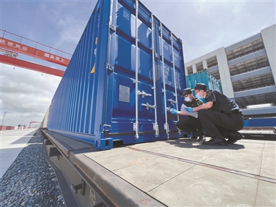 廣州海關所屬南沙海關關員對中歐班列集裝箱進行監管