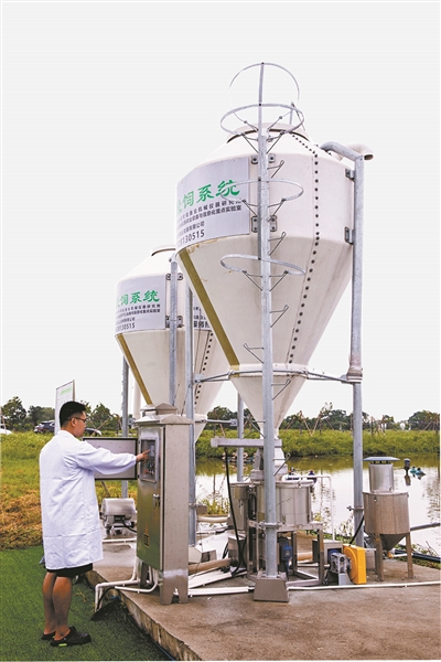 研發(fā)專員高鑫在魚塘邊設置自動投飼系統(tǒng)。