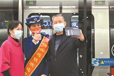 佛山地鐵2號線開通首日現(xiàn)場,乘客與地鐵工作人員合影。