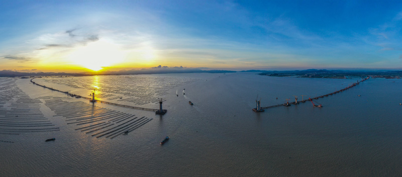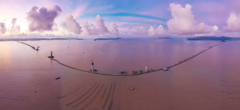 建設中的黃茅??绾Mǖ溃?月27日攝,無人機全景照片)。黃茅??绾Mǖ罇|起珠海市平沙鎮,西接江門市斗山鎮,橫跨珠江口崖門入海口黃茅海水域,線路全長約31公里,預計2024年建成通車。