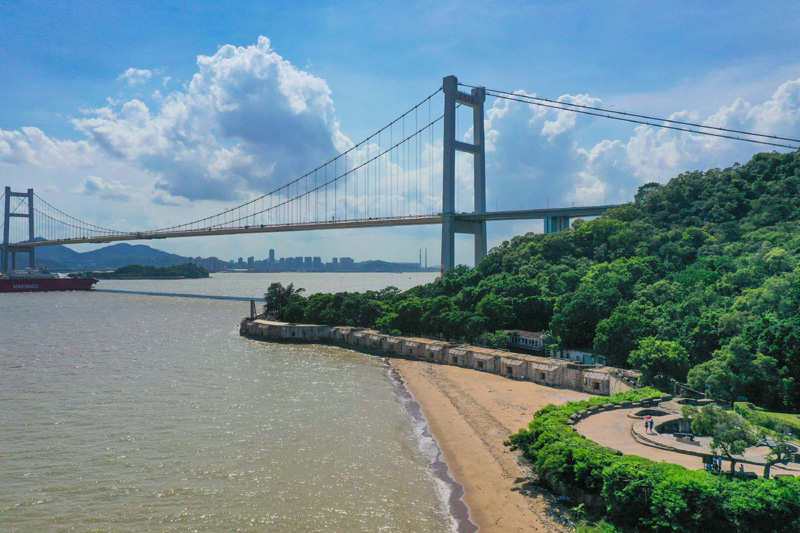 虎門大橋緊鄰鴉片戰爭古戰場遺址之一的威遠炮臺(2020年6月23日攝,無人機照片)?;㈤T大橋橫跨珠江口獅子洋水道,連接廣州市南沙區與東莞市虎門鎮。