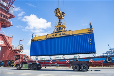 在廣州港南沙集裝箱碼頭,裝載貨物的集裝箱正從接駁船上卸下轉運。