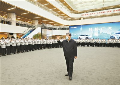 4月10日至13日,中共中央總書記、國家主席、中央軍委主席習近平在廣東考察。這是12日下午,習近平在廣汽研究院向職工們揮手致意。
