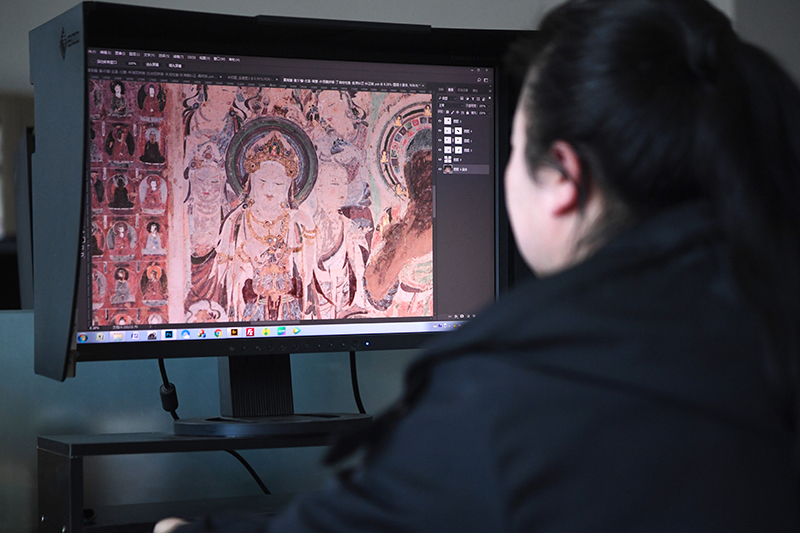 敦煌研究院文物數字化保護團隊圖像處理人員年海麗在拼接壁畫圖像(2023年4月25日攝)。數字化探索為莫高窟的保護與傳承開辟了全新路徑,數字技術讓敦煌文物走出洞窟,跨出國門,走向“永久保存、永續利用”。